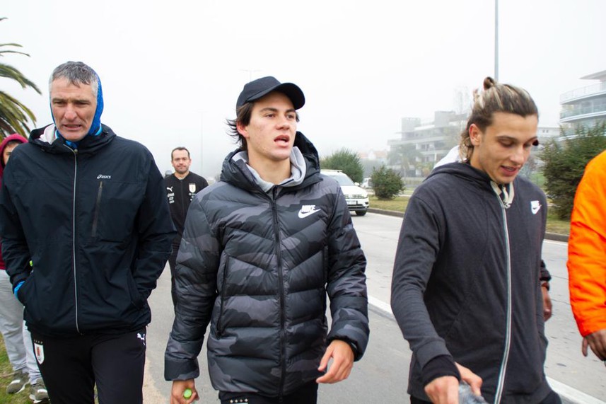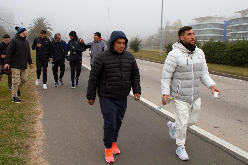 Los futbolistas celestes desafiaron el frío y la neblina para emprender el viaje en bicicleta desde el Parque Batlle, pasando por la rambla y llegando al Parque Roosevelt en un trayecto aproximado de 20 kilómetros. Ahí dejaron las chivas y siguieron 15 kilómetros a pie.
