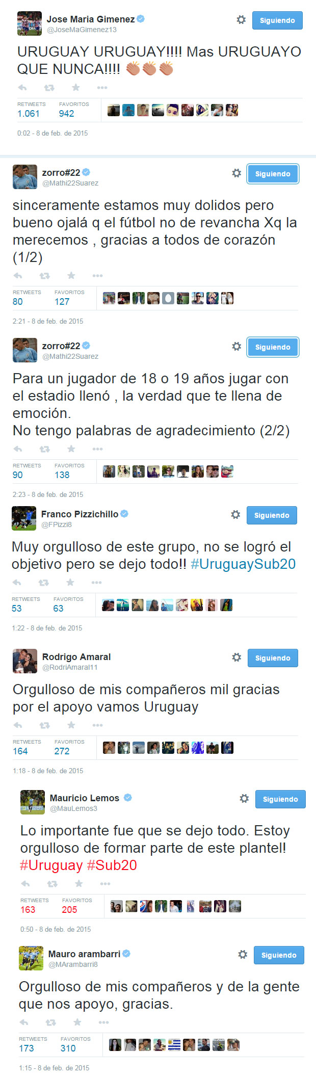 Cinco futbolistas de la selección uruguaya sub-20 eligieron la red social Twitter para expresar sus primeros sentimientos después de terminado el Sudamericano de la categoría, en el que se colgaron una medalla de bronce que, para muchos, dejó sabor a poco.