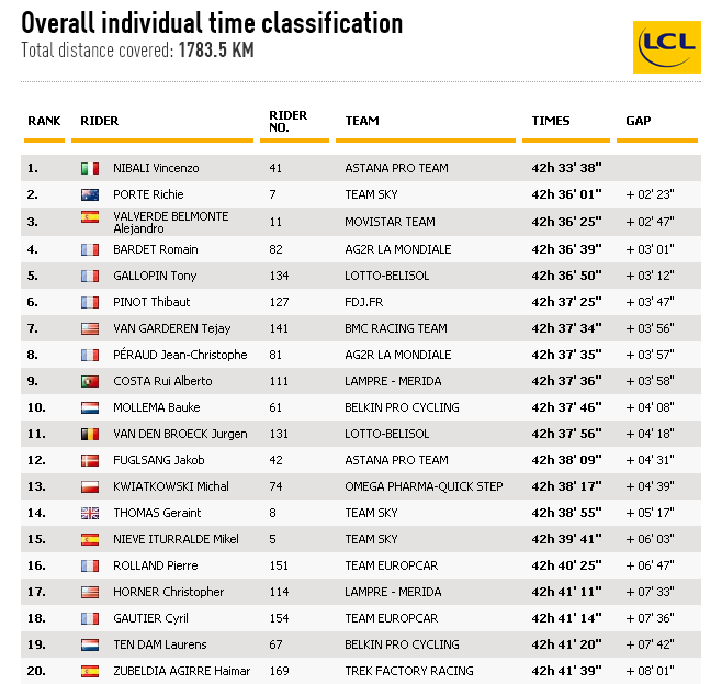 Por detrás llegó el francés Thibaut Pinot, que es de la zona, y tercero fue el español Alejando Valverde, que ocupa ahora el mismo puesto en la general, a 2.47 del italiano. Segundo es el australiano Richie Porte a 2.23.