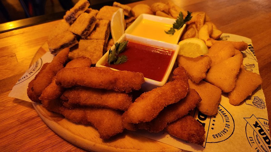 Picada de campo con bastoncitos de pollo en Yuda’s Resto Garden
