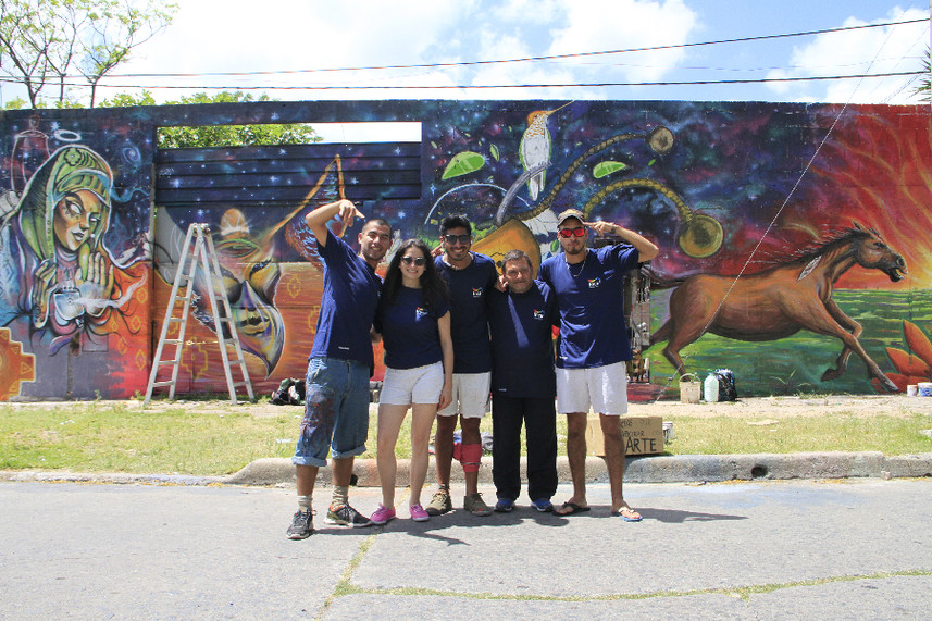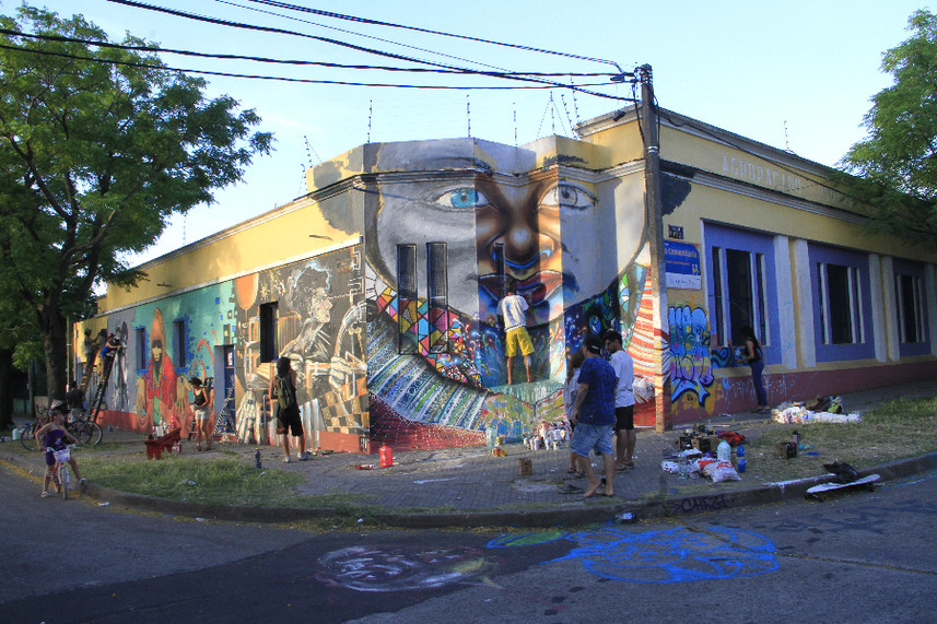 Juan Ignacio Echandía, "Jota", tiene 24 años y es chileno. Junto a un grupo de artistas y vecinos se reunió el viernes temprano para hacer una lluvia de ideas sobre elementos que describieran la cultura latinoamericana y uruguaya. Así nació un mural compuesto por un mate, boleadoras, un caballo que refleja la garra charrúa y una virgen con toques carnavalescos, símbolo de la protección y el amor al barrio.