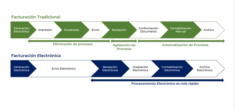 Antes, el proceso de facturación consistía en la emisión manual de la factura, envío, cobro, archivo, entre otros procesos. El mayor cambio con el nuevo sistema es que se elimina el papel y los procesos de intercambio de información entre las empresas y la DGI se acelera: