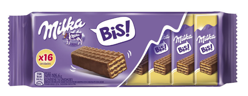 El nuevo "Milka Bis" se presenta en un formato pensado para compartir con amigos, en el trabajo o en una jornada de estudio. Se trata de una bandeja de 16 unidades de obleas de 6 gramos cada una, individualmente empaquetadas. Es un snack dulce con la porción justa para disfrutar de la mejor combinación de oblea y chocolate en cualquier momento y lugar.