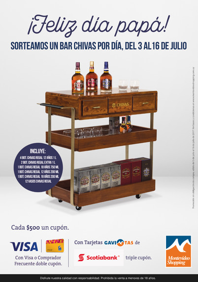 La segunda propuesta de Montevideo Shopping para el Día del Padre tiene como regalo a un Pack Chivas Regal compuesto por un Chivas Regal 12 años de 200 ml., un Chivas Regal Extra de 200 ml. y 2 vasos Chivas.