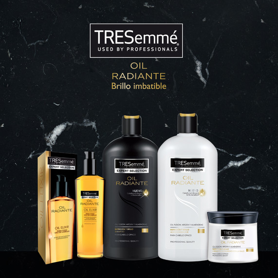 Acondicionador: La fórmula nutritiva del nuevo Acondicionador TRESemmé Oil Radiante enriquecida con aceite de argán y almendras cuida el cabello de adentro hacia afuera dejándolo nutrido para un brillo duradero. Su exclusivo acondicionador nutre profundamente las fibras capilares proporcionando un brillo intenso y luminoso.