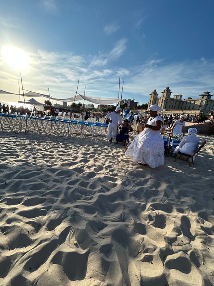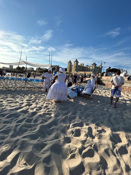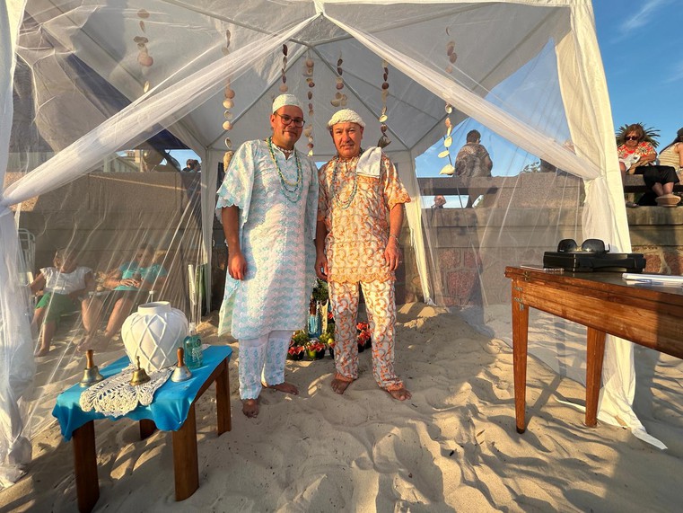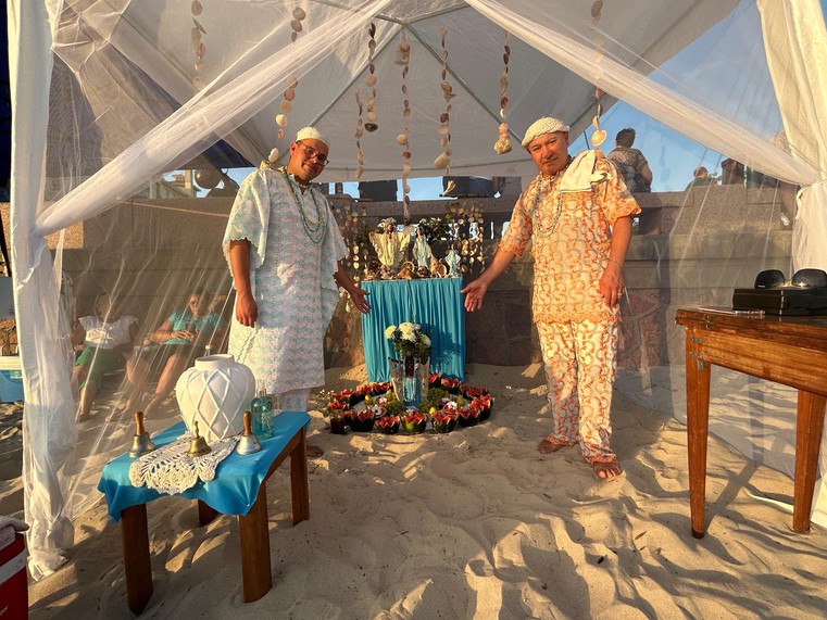 Durante la jornada, en tiendas instaladas a lo largo de la playa, maes y caboclos practican sus rituales al ritmo de tambores y cencerros, mientras largas filas de creyentes aguardan el momento de ser bendecidos.