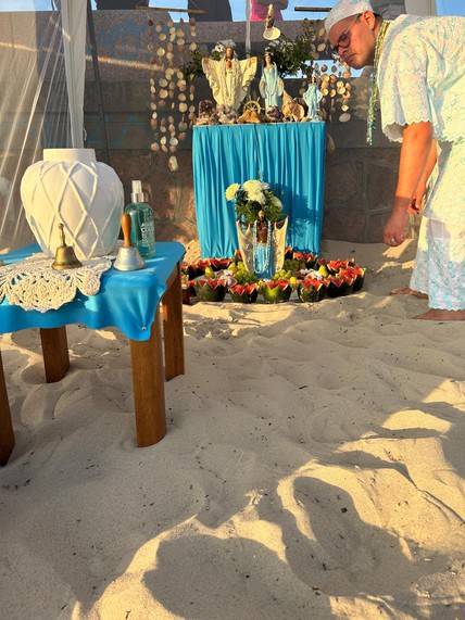 Adriano, otro de los presentes, mostró la ofrenda que hace todos los años para la “gran reina del mar”. La mesa estaba compuesta por sandía y otras frutas, “lo que hace a una madre venerada por sus hijos y lo que hace que ella se apegue a sus hijos”.