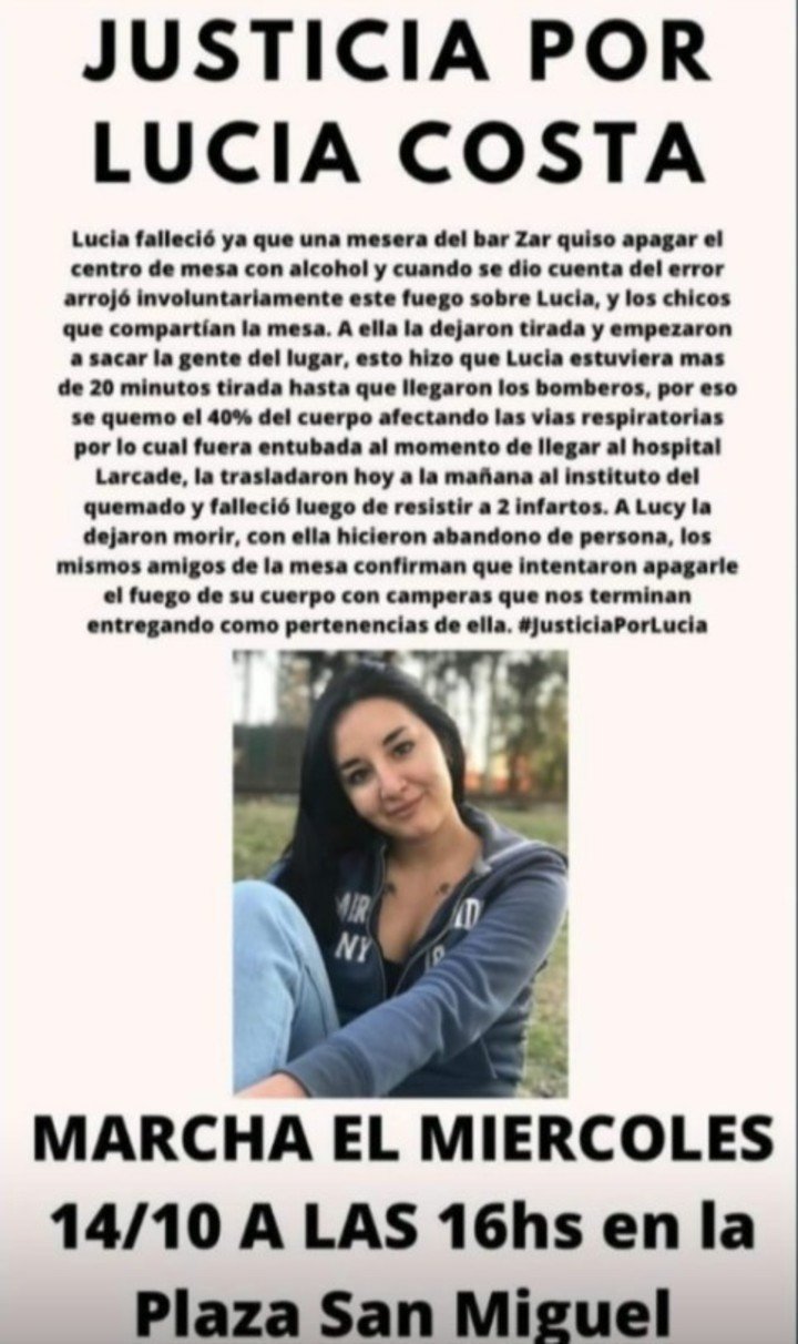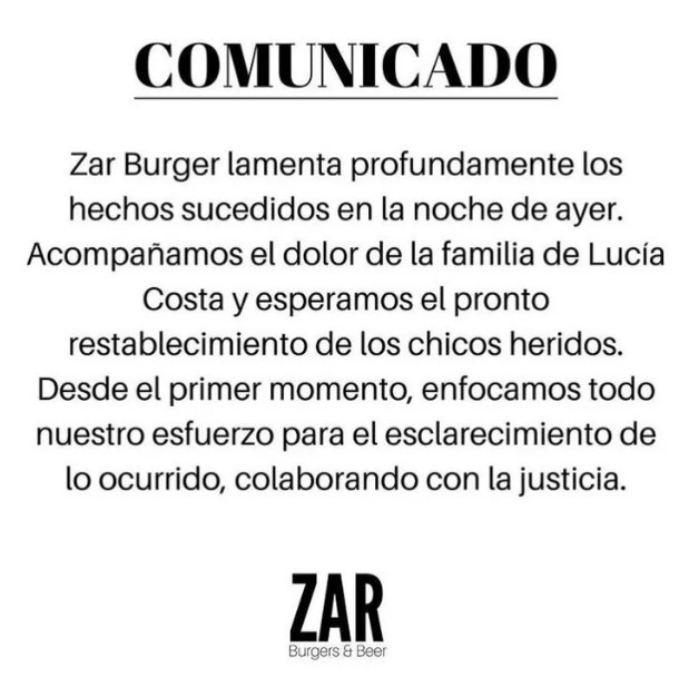 En la madrugada del domingo, el bar Zar Burgers publicó un comunicado en sus redes sociales en el que "lamenta profundamente los hechos sucedidos" en la noche del viernes y acompaña "el dolor de la familia de Lucía Costa".