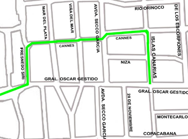 La Avenida Gral. Oscar Gestido permanecerá cortada a partir del 14 de febrero, entre las calles Islas Canarias y Mar del Plata. El desvío de transporte establecido por la Intendencia de Canelones será por las calles: Islas Canarias, Cannes y Fresnedo Siri. De no sufrir imprevistos el corte y desvío se mantendrán por un período de dos semanas, informó la empresa Consorcio Canario.