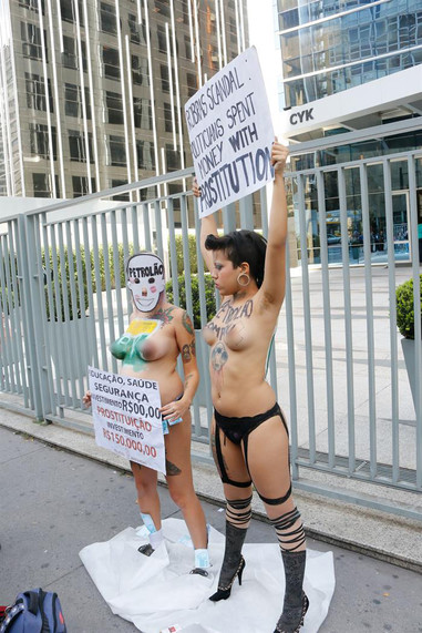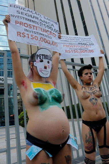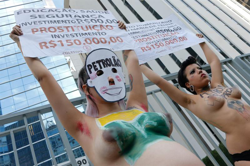 Un grupo de feministas brasileñas protestaron frente a la sede de Petrobras en San Pablo por el uso indebido de dinero público para pagar "fiestas de lujo y prostitución" para algunos directivos y políticos brasileños implicados en el escándalo de corrupción de la empresa estatal.
