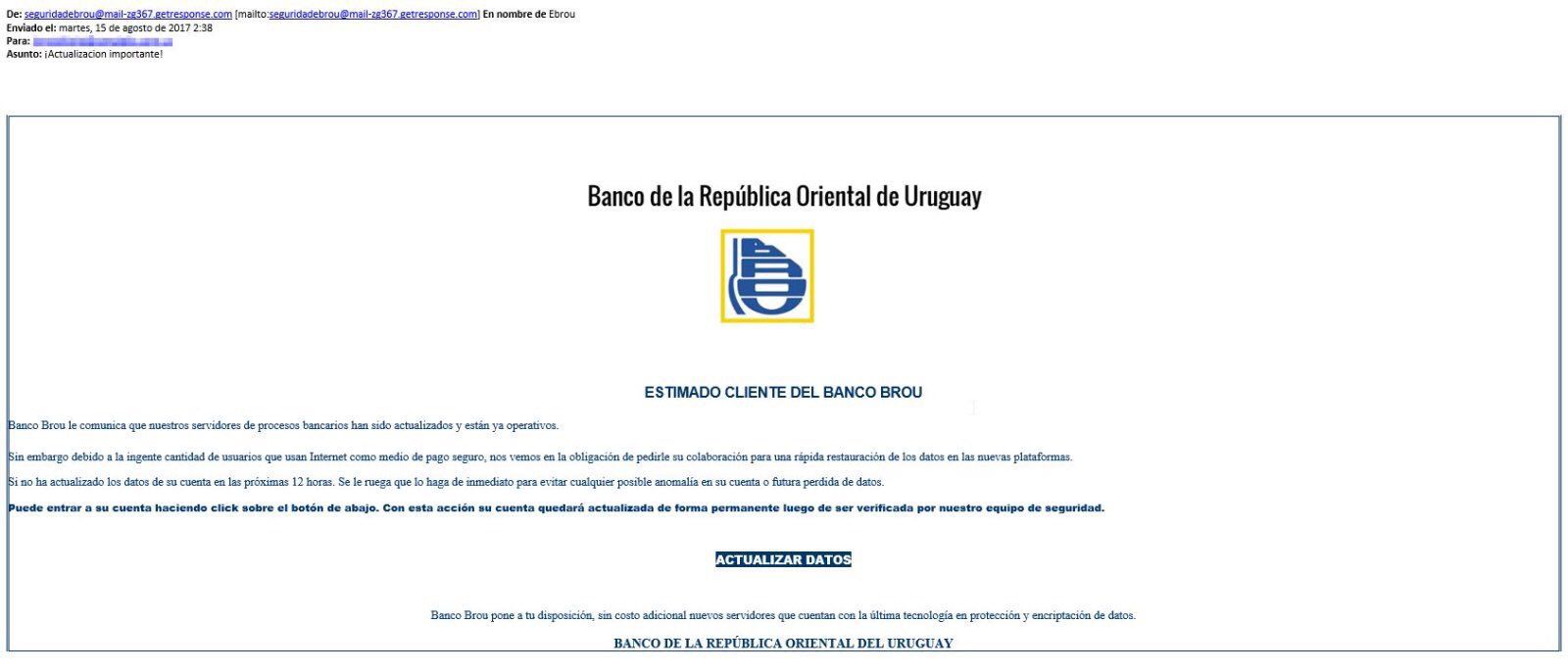Varios usuarios del BROU recibieron en los últimos días un supuesto correo electrónico de la institución que solicitaba a los clientes "actualizar datos" en el marco de un proceso de "restauración" de sus bases de datos.