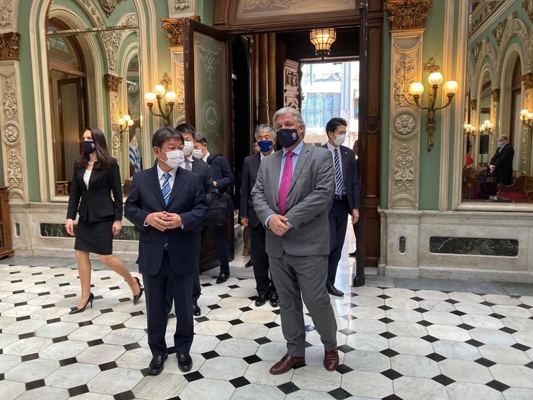 El Ministro de Relaciones Exteriores de Japón, Toshimitsu Motegi, se reunió en la tarde de este miércoles con el canciller Francisco Bustillo en el marco de la celebración del centenario del establecimiento de relaciones diplomáticas bilaterales entre Uruguay y Japón.