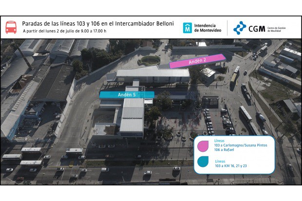 Precisamente, el Intercambiador Belloni modificará su operativa para recibir a los nuevos servicios. Según la IM, quienes viajen hacia el Centro en un 103 desde Carlomagno o 106 desde Rafael deberán descender en la terminal y cambiar de unidad, utilizando el mismo boleto de 1 Hora.
