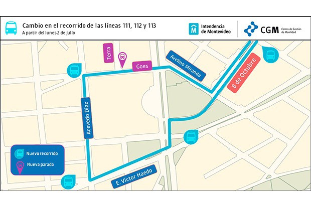 En la esquina de Goes y Terra se instalará una nueva parada para estas líneas, que luego rodearán la zona para salir nuevamente a 8 de Octubre y continuar el recorrido en sentido inverso. La nueva parada funcionará como un "punto de intercambio", que extiende el tiempo de validez de las tarjetas STM.