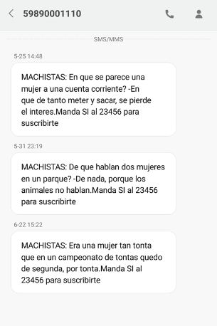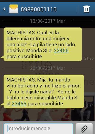 "¿Cuál es la diferencia entre una pila y una mujer? La pila tiene un lado positivo", reza uno de los chistes disponibles en la categoría "machistas" de la sección "chistes" o "humor" que pueden encontrarse en la sección de servicios de SMS automáticos de Antel, Movistar o Claro.
