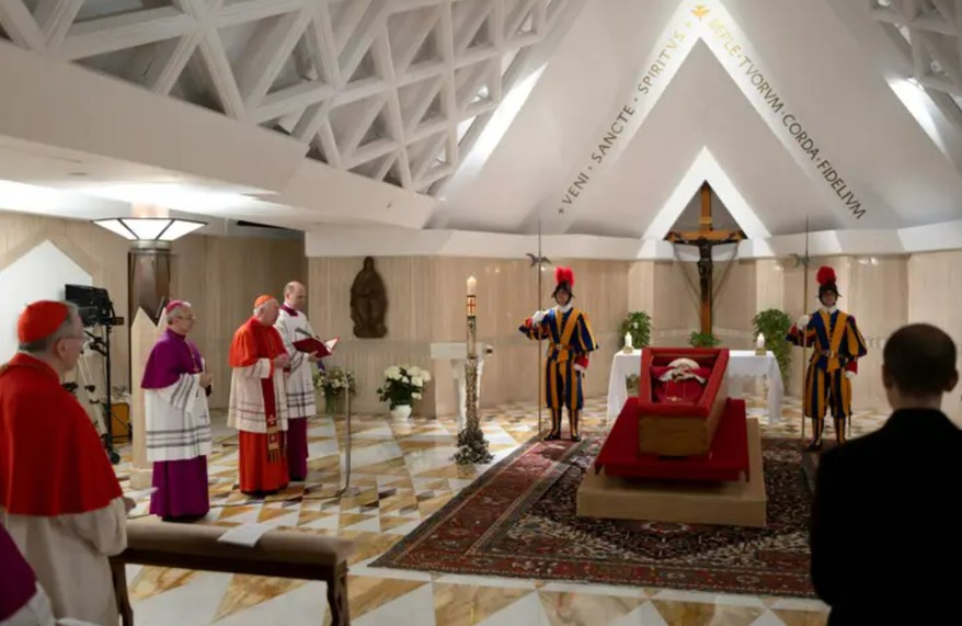 El féretro fue fotografiado flanqueado por dos guardias suizos en la capilla de la Residencia Santa Marta, donde vivió Francisco.