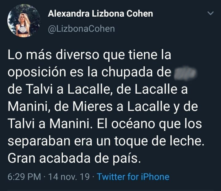 "Lizbona me dice que cerró su cuenta porque la amenazaron. Le dije que iba a poner eso. Y le dije que después de meter un tuit así, en un lugar sin ley, no podía pretender besos", añadió.