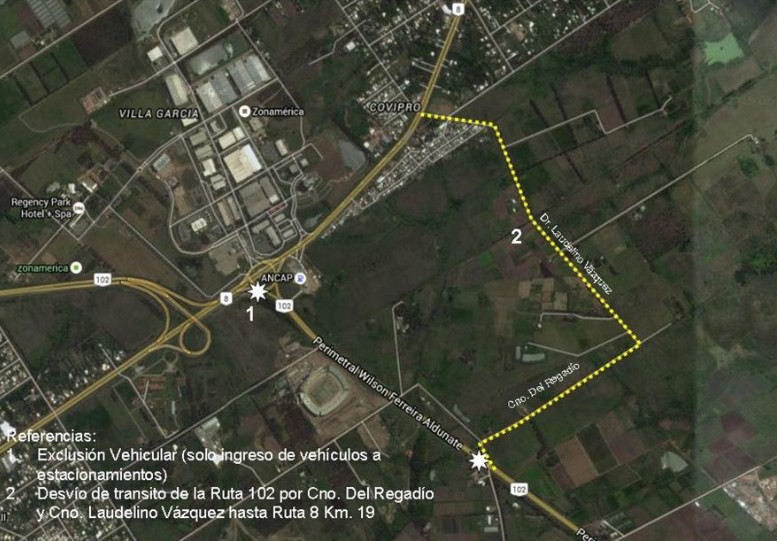 En la intersección de Ruta Nº 102 y Cno. Del Regadío, se hará desvío de tránsito hasta Ruta Nº 8 a quienes no concurran al espectáculo, preservando la zona de exclusión dispuesta.