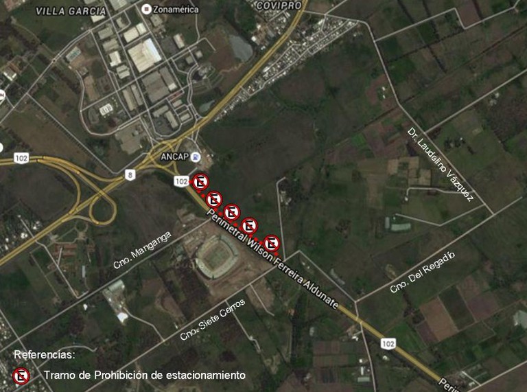 Se establecerá una zona de exclusión vehicular en la Ruta 102 (Perimetral Wilson Ferreira Aldunate), en el tramo comprendido entre la Ruta Nº 8 y Cno. Del Regadío, con prohibición total de estacionamiento. Los vehículos que no respeten esta disposición serán pasibles de multa y retiro del vehículo a zonas habilitadas para estacionamiento.