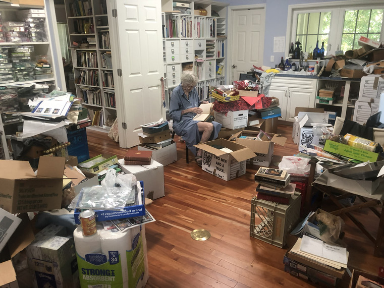 Latas de comida, moldes de muffins, material de oficina y toda una biblioteca de libros de historia del arte llenaban todos los rincones de su casa. Montones de papeles se desparramaban por la cama. El baño de invitados llevaba una década inutilizado porque las cajas de papeles impedían que se abriera la puerta.