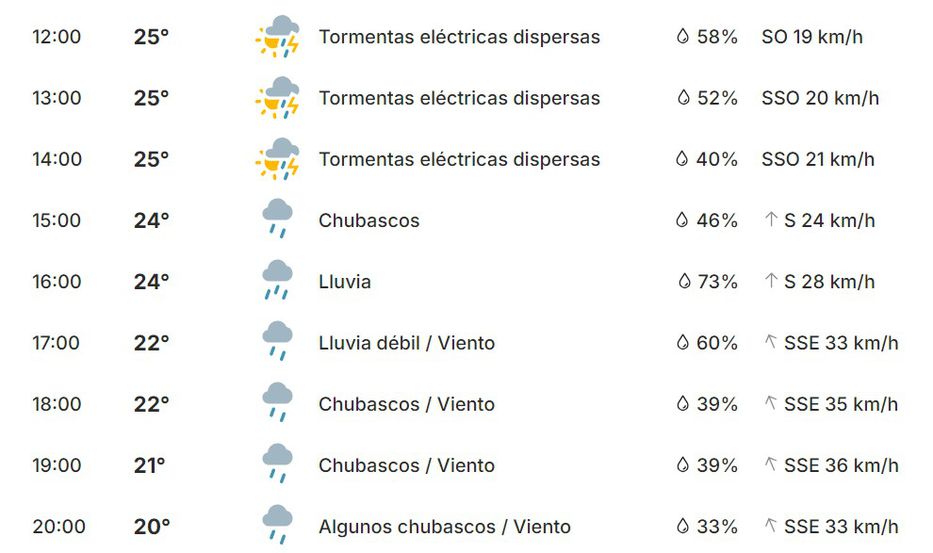 Por su parte, la plataforma internacional The Weather Channel detalla que en Montevideo las tormentas eléctricas comenzarían sobre el mediodía, seguidas de lluvias que empezarían a las 15.00 horas y se prolongarían hasta las 20:00.