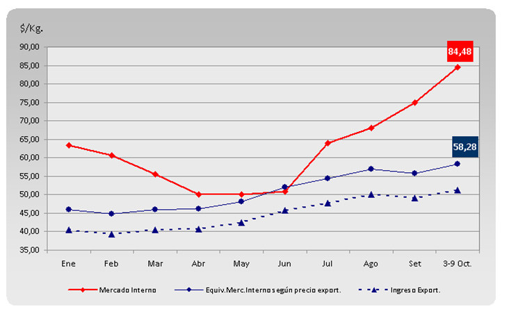 Se trata de un estudio comparativo entre Exportación y Mercado Interno entre el 1º de enero y el 9 de octubre de 2010, que muestra que el precio de la carne que los frigoríficos venden a las carnicerías locales ronda actualmente los 85 pesos, mientras que para el mercado de exportación de ubica en los 58 pesos.