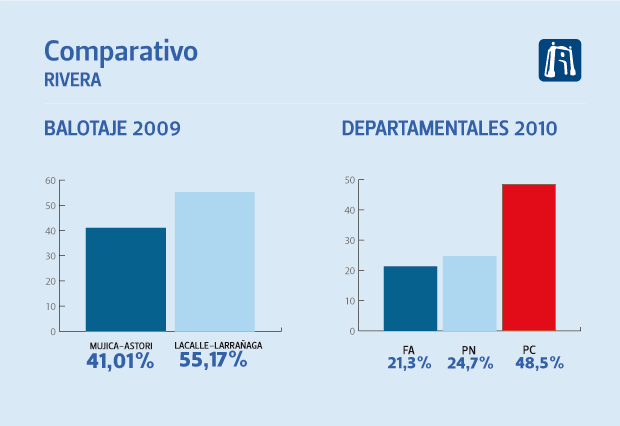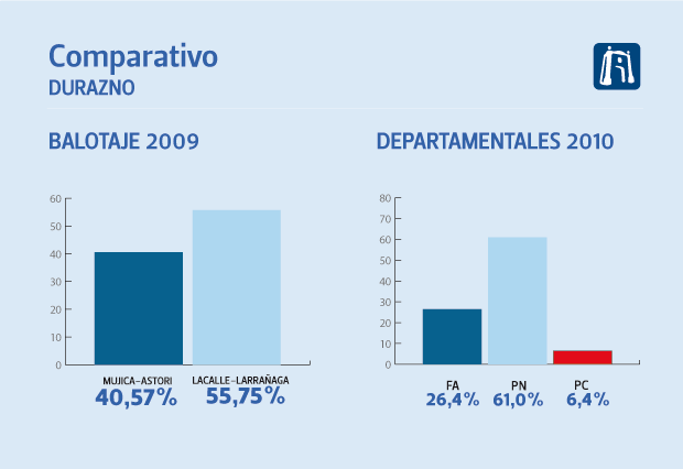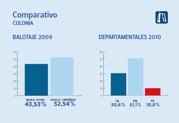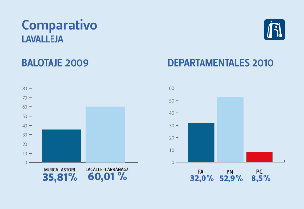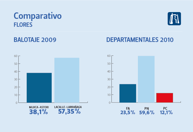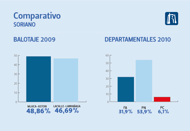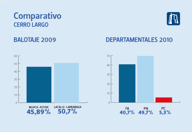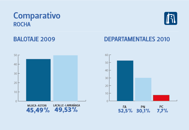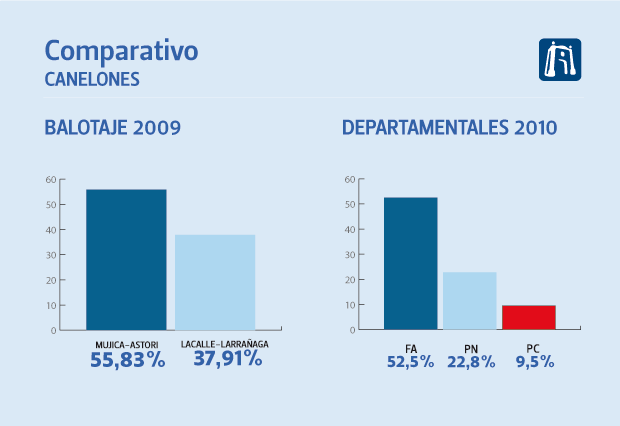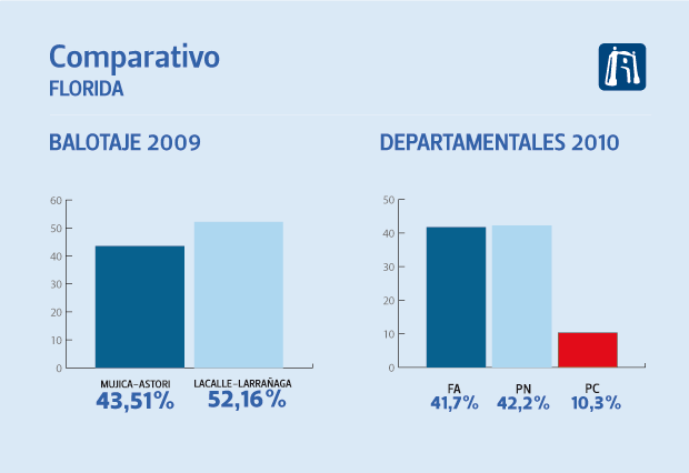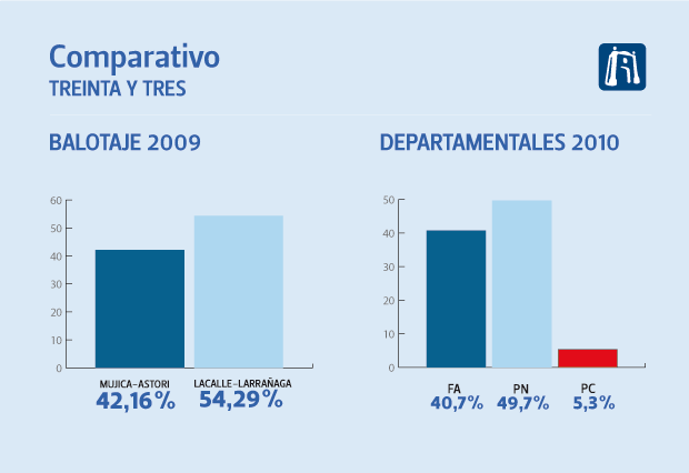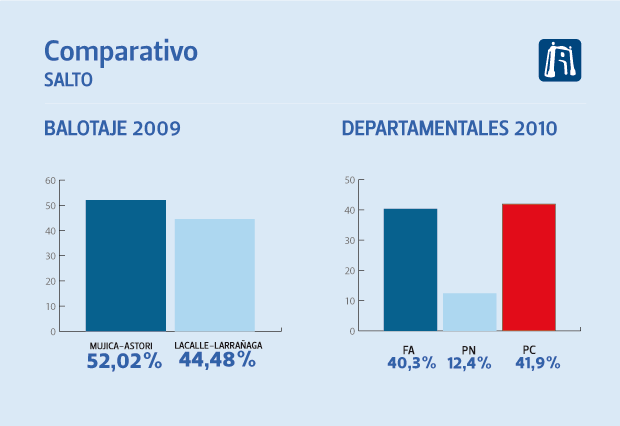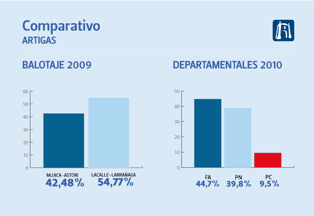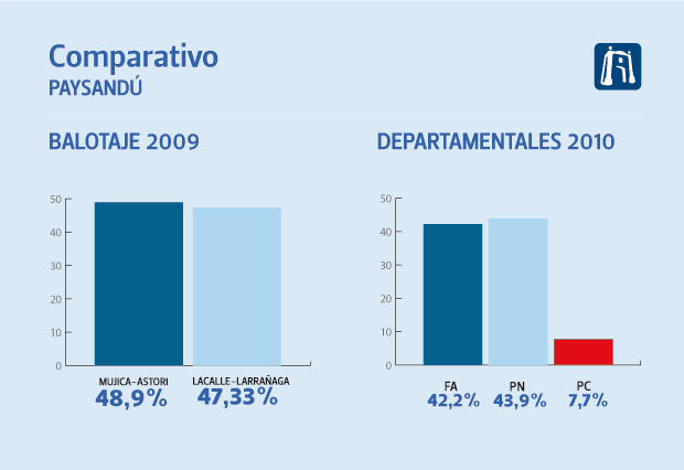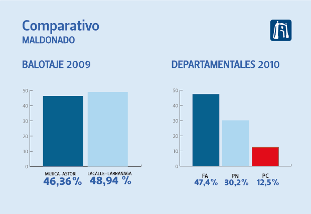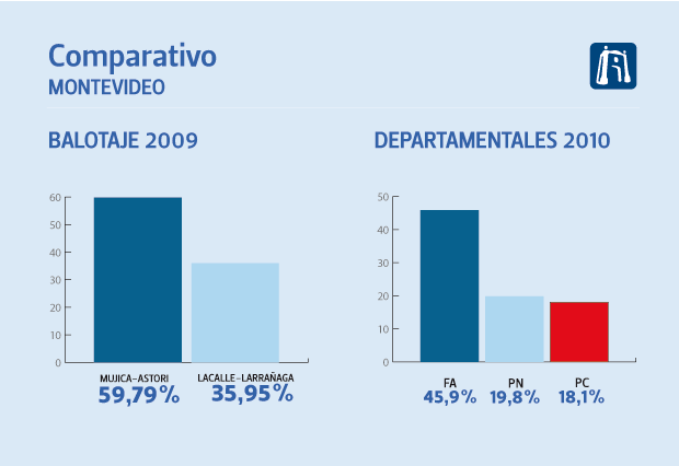 En el balotaje del 2009, Mujica y Astori ganaron en cinco departamentos: Montevideo, Canelones, Salto, Paysandú y Soriano. Pocos meses después se realizaron las elecciones municipales y el Frente Amplio obtuvo también cinco intendencias: repitió en Montevideo y Canelones con respecto al balotaje, y ganó en Maldonado, Rocha y Artigas.