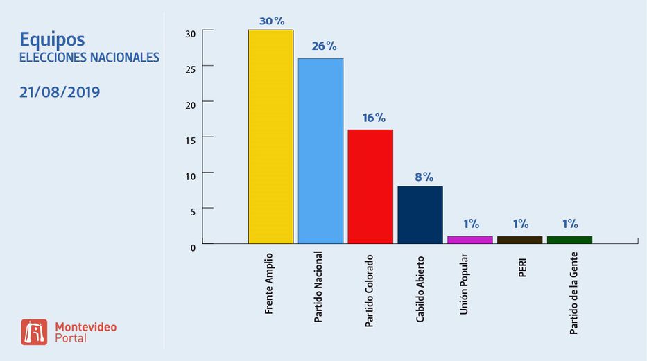 En concreto, el estudio presentado en Subrayado por Ignacio Zuasnabar muestra que el Frente Amplio tiene 30 %, el Partido Nacional tiene 26 %, el Partido Colorado tiene 16 % y Cabildo Abierto tiene 8 %.