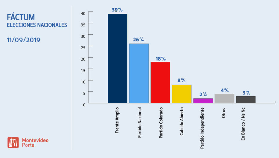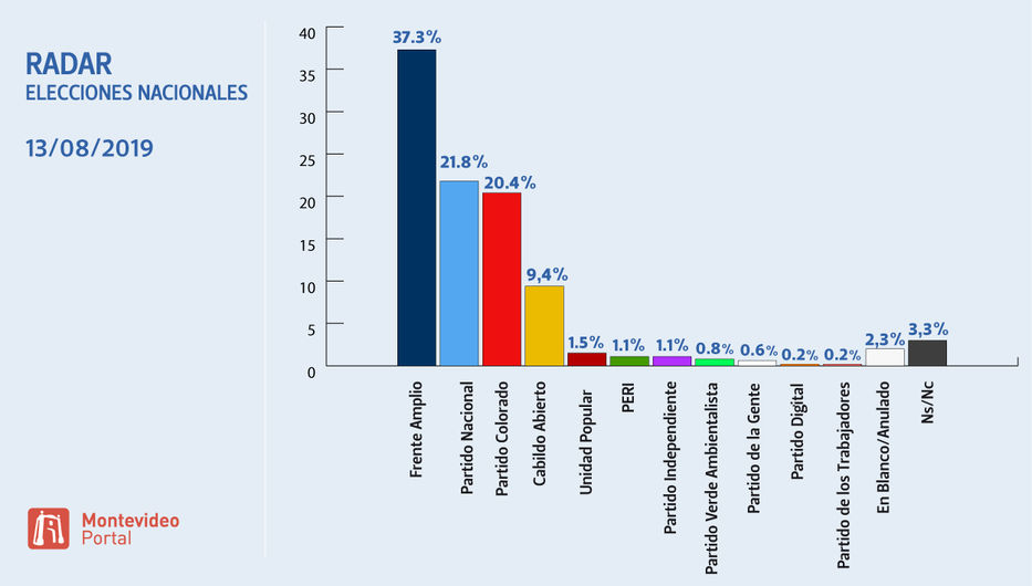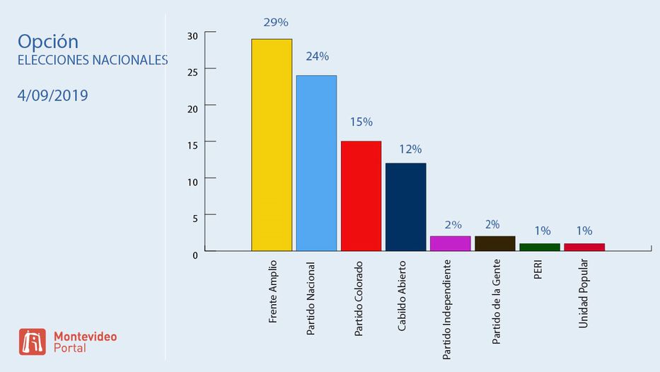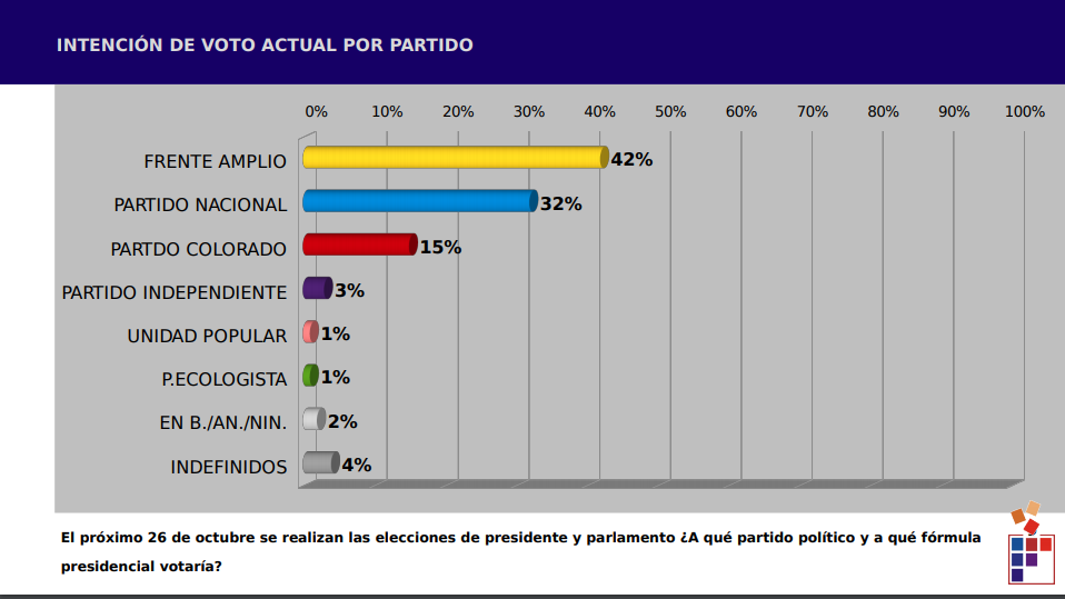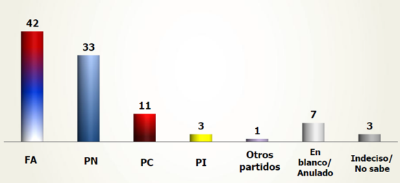 En concreto, de cara a las elecciones nacionales de octubre la encuesta dio un 33 % de intención de voto al Frente Amplio, 25 % al Partido Nacional, 22 % al Partido Colorado y 5 % a Cabildo Abierto.