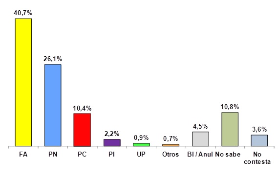 A la pregunta "Si las elecciones nacionales fueran hoy, ¿a qué partido o candidato?", las respuestas espontáneas fueron las siguientes: un 40,7% votaría al Frente Amplio, un 26,1% al Partido Nacional, un 10,4% al Partido Colorado, un 2,2% al Partido Independiente, un 0,9% a Unidad Popular, un 0,7 a otros partidos, 4,5% votaría en blanco o anulado, y un 10,8% no sabe y 3,6 no contesta la pregunta.