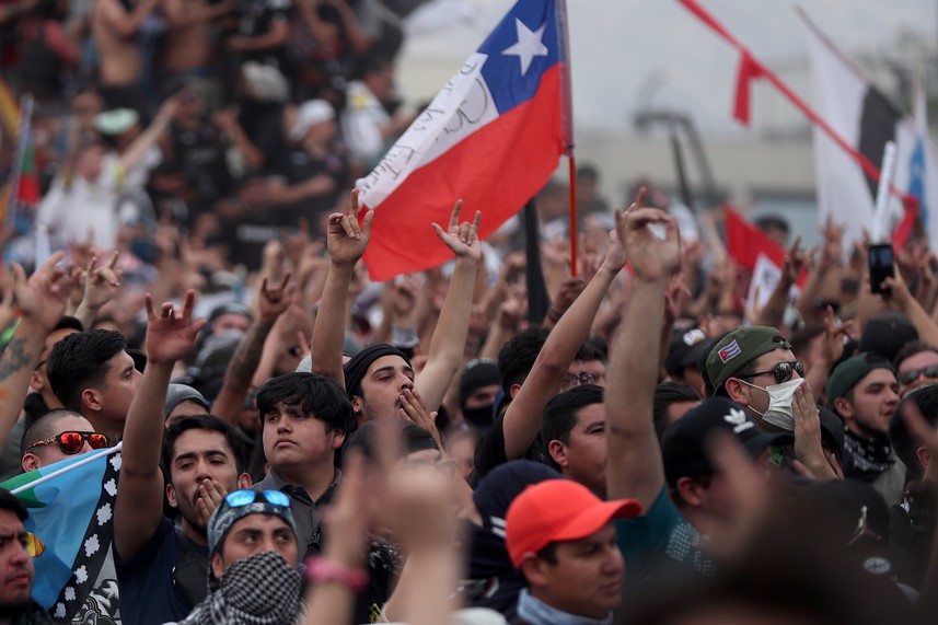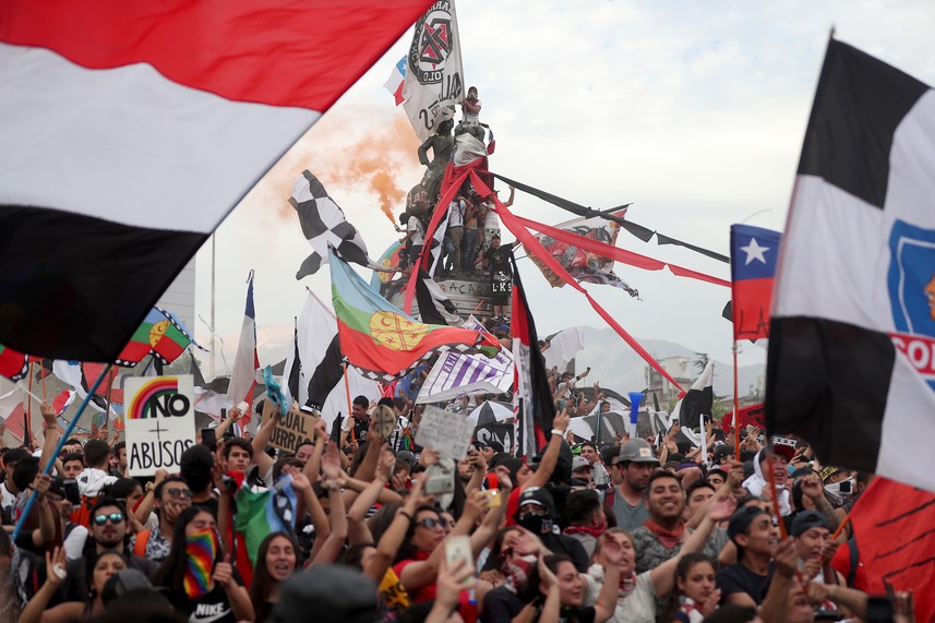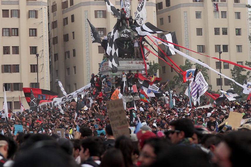 En el centro de la plaza protestaban hermanadas las barras bravas de la Universidad de Chile, Colo Colo y Universidad Católica, los tres clubes más históricos del fútbol chileno.