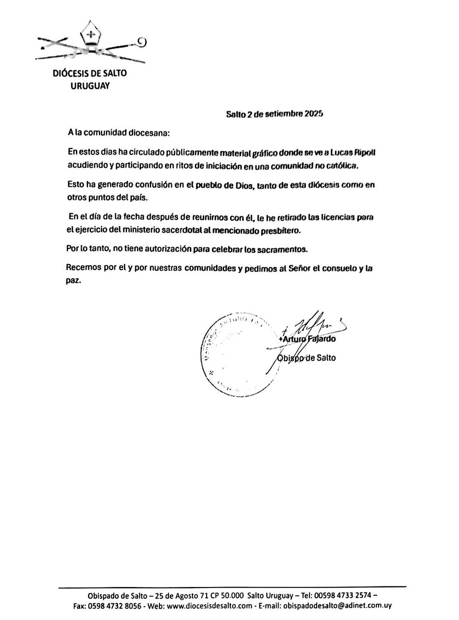 “En estos días, ha circulado públicamente material gráfico en el que se ve a Lucas Ripoll acudiendo y participando en ritos de iniciación en una comunidad no católica. Esto ha generado confusión en el pueblo de Dios”, afirma Arturo Fajardo, obispo de Salto, en un comunicado.