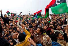 Miles de personas, haciendo ondear la bandera verde, negra y roja de la nueva Libia, se concentraron en la plaza central de Bengasi, segunda ciudad del país y origen de la revuelta iniciada a mediados de febrero contra el régimen de Gadafi, para seguir en directo la ceremonia de proclamación.