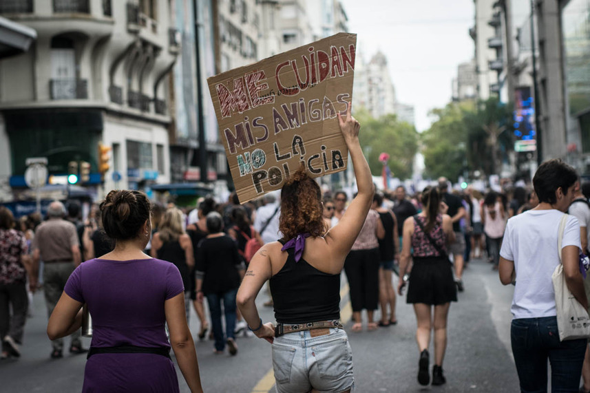 Con tambores, color y alegría, las manifestantes marcharon en paz, a pesar del despliegue policial que preparó el Ministerio del Interior con drones, helicópteros, decenas de efectivos policiales apostados en las calles laterales a 18 de Julio, vallas y vehículos. Varias feministas tildaron de "provocador" el operativo dispuesto por el Interior.
