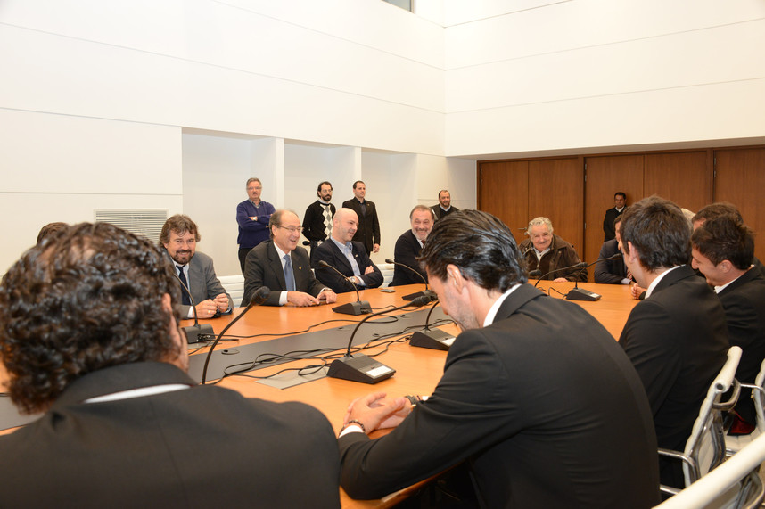 El plantel del Atlético de Madrid, que el domingo se medirá con Nacional, visitó al presidente José Mujica en la Torre Ejecutiva. Allí recibió y dialogó especialmente con los uruguayos que militan en filas colchoneras: Diego Godín, Cristian Rodríguez y Leandro Cabrera. En el encuentro, el presidente habló de su reciente visita oficial a España, y de los lazos culturales que unen a ambos países.