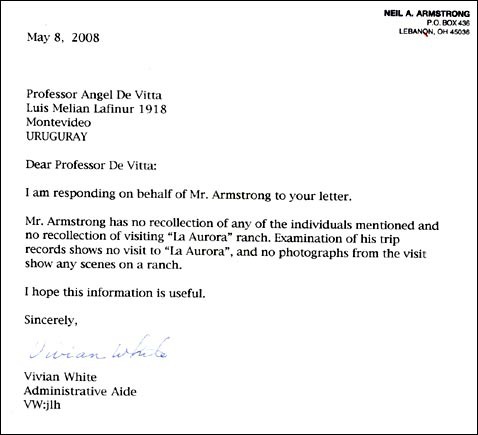 La carta afirma que "el señor Armstrong no tiene recuerdo de ninguno de los individuos mencionados ni de visitar la estancia "La Aurora". El examen de los registros de este viaje no muestran ninguna visita a "La Aurora", y ninguna fotografía de la visita muestran ninguna escena en una estancia".