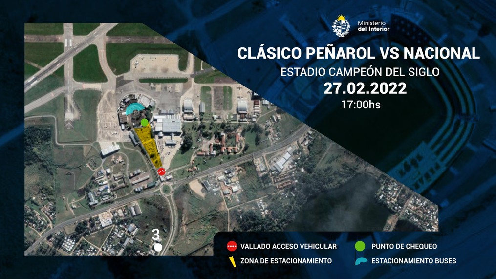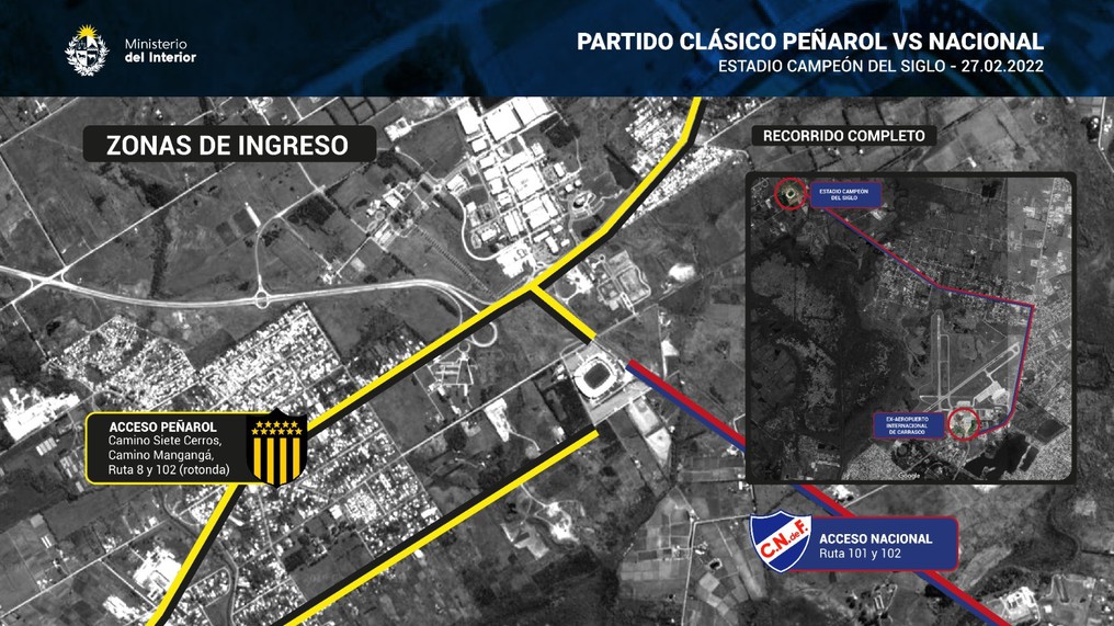 En el ex Aeropuerto Internacional de Carrasco, los hinchas pasarán por las cámaras de reconocimiento facial y se realizarán los controles policiales y de entradas para pasar a una zona neutra hasta próximo a las 13:45, donde se subirán a los ómnibus que los trasladarán hacia el Estadio Campeón del Siglo sobre las 15:00. Una vez los hinchas lleguen al escenario deportivo podrán ingresar directamente a la tribuna asignada.