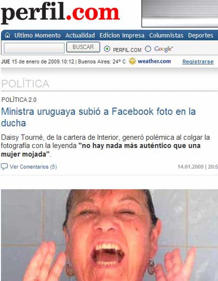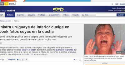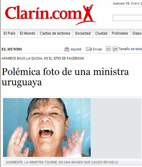 Desde que el martes se supo que en la cuenta Facebook de la Ministra Tourné había una foto en la que aparecía duchándose, la misma no tardó en trepar a las páginas de los medios nacionales, Montevideo Portal incluido. Poco después, la húmeda fotografía cobraría dimensión internacional. La información, imagen incluida, pudo verse en sitios web de la vecina orilla, como Clarín, Perfil o Infobae. También las agencias noticiosas difundieron la información, y pronto los azulejos de la ducha de Tourné lucieron en portales de todo el mundo.