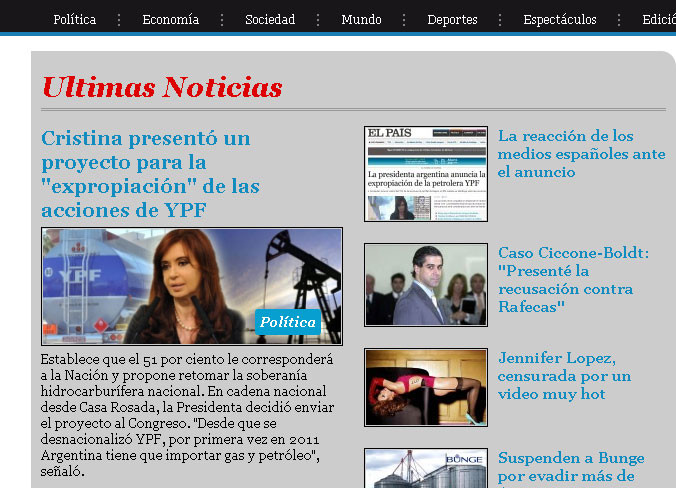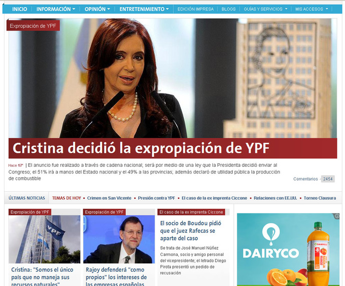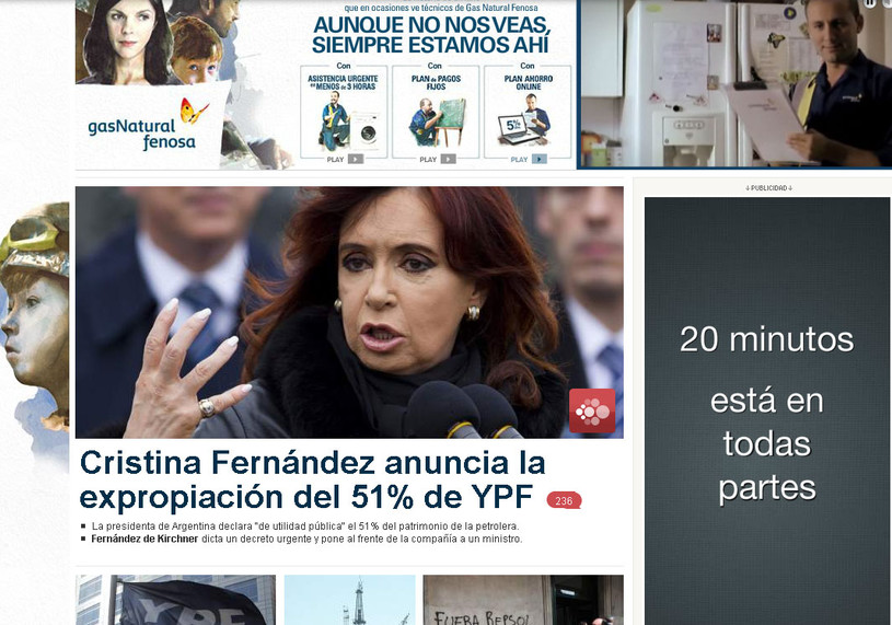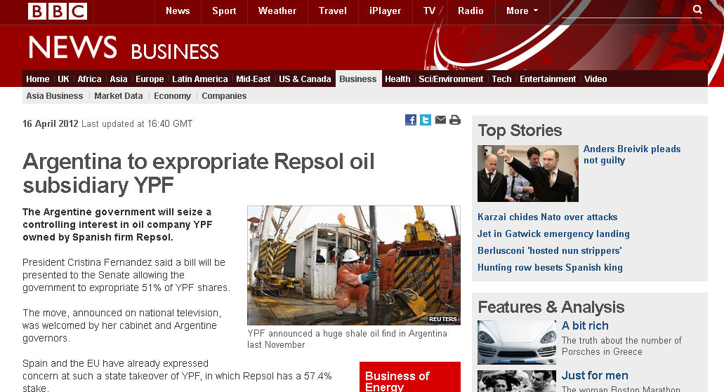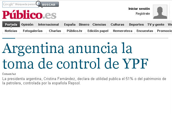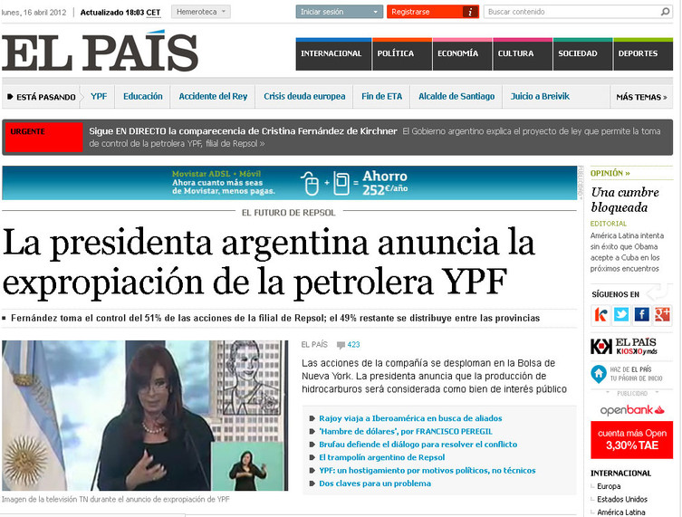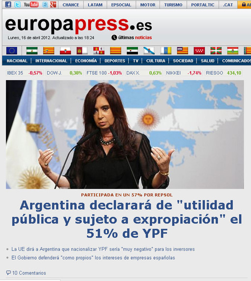 La decisión de la presidenta argentina de expropiar el 51% de las acciones de YPF, en manos de la española Repsol, tuvieron sus inmediatas repercusiones: la cotización de las acciones de la petrolera fueron suspendidas el lunes en la Bolsa de Buenos Aires. Tras una apertura al alza, las acciones de YPF perdían un 2,44 por ciento antes de la suspensión.