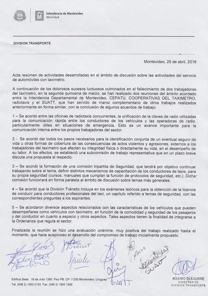 Los trabajadores y propietarios de taxis acordaron con la Intendencia de Montevideo acordaron este viernes varias de las medidas reclamadas por el Suatt (Sindicato Único de Automóviles con Taxímetro y Telefonistas) para mejorar la seguridad en el sector, tras el diálogo iniciado como consecuencia del asesinato de dos taxistas en los últimos meses.