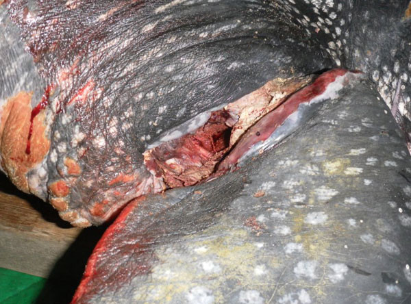 La tortuga apareció en la playa porque se enredó con líneas de pesca. Esto "fue lo que le ocasionó la herida cortante y ahora está en evaluación y tratamiento para que la herida cicatrice", explicó. Si bien este tipo de animales "son difíciles de manejar por su tamaño, se le está dando antibióticos para reforzar sus defensas y posteriormente será liberado en el océano".