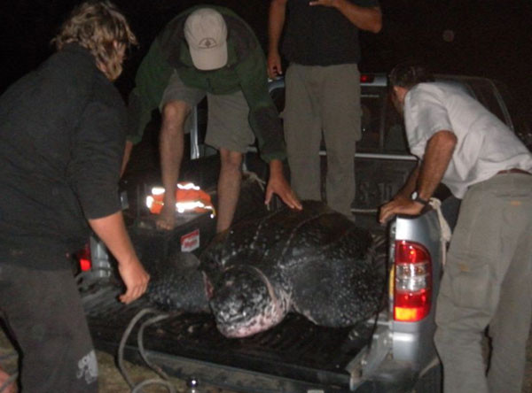 Esta tortuga llega a pesar unos 800 kilos y a medir unos 2 metros de largo. En este momento, "que el animal es joven, tiene 1.30 metros de caparazón, 1.50 metros de largo y pesa unos 150 kilos. Es la primera vez que trabajamos en la rehabilitación de un animal de esta especie", añadió Estrade.