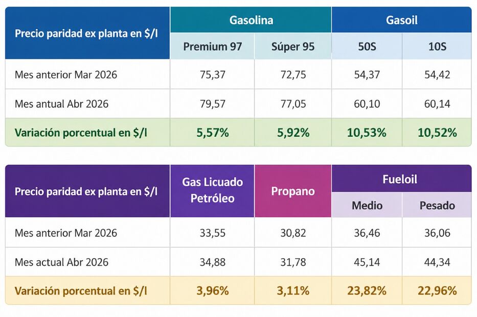 De acuerdo con el informe, los mayores aumentos se concentran en los fuelóleos, seguidos por los gasóleos y las gasolinas. En tanto, el GLP y el propano presentan alzas de menor magnitud.