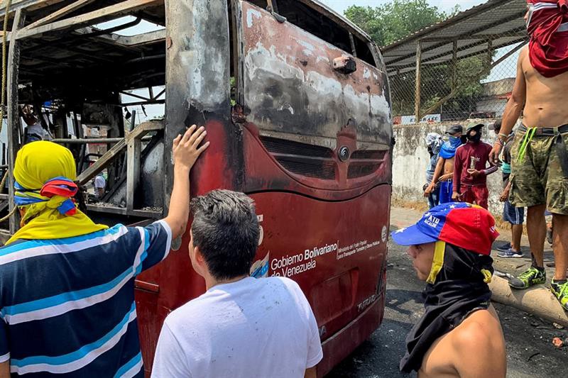 Un grupo de manifestantes, la mayoría encapuchados, destruyó este sábado al menos dos autobuses en la urbe venezolana de Ureña, fronteriza con Colombia, y uno fue incendiado, en medio de los disturbios por el cierre de los puentes que comunican ambas naciones ordenado por el Gobierno de Nicolás Maduro.