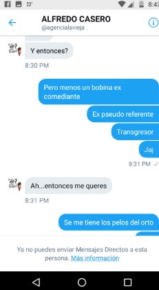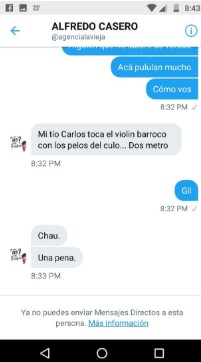 Luego siguió la discusión y largo rata hasta qye Casero terminó con la siguiente frase: "Mi tío Carlos toca el violín barroco con los pelos del culo... Dos metros. Chau, una pena".