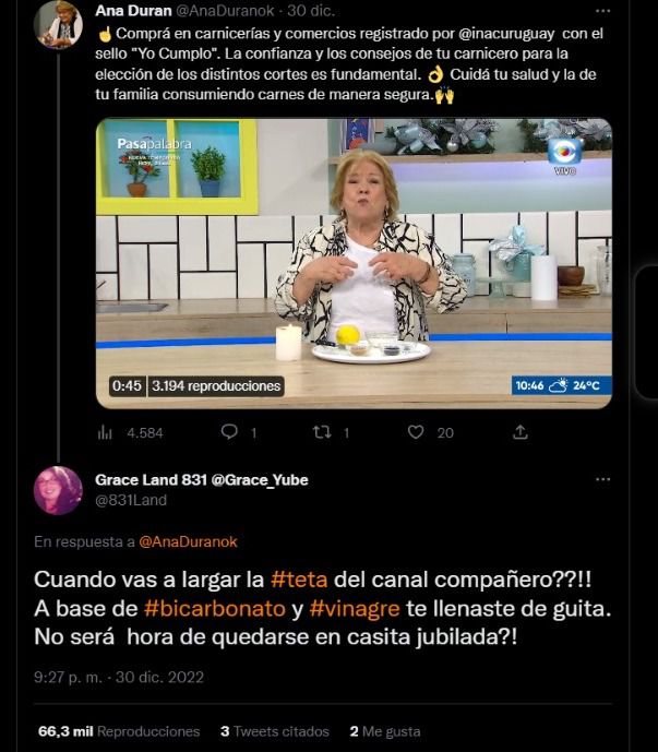 "¿Cuando vas a largar la teta del canal compañero?", preguntó una usuaria de Twitter a Ana Durán, en respuesta a un video publicitario que subió la comunicadora promocionando la compra en carnicerías y comercios registrados por el Instituto Nacional de la Carne (INAC).