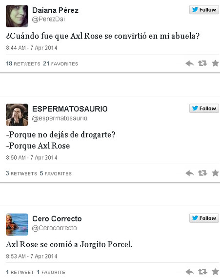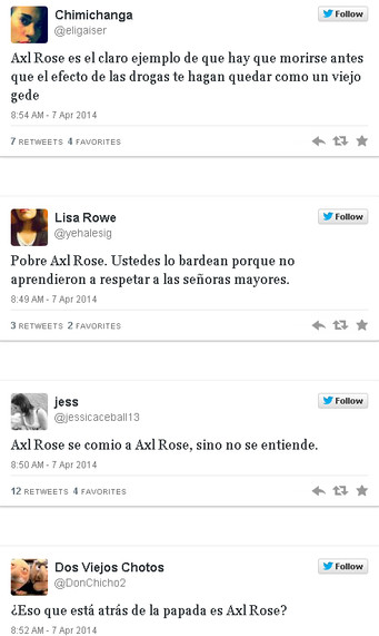 Esta vez le tocó comprobarlo a Axl Rose, cuyo look despertó la vena burlona de los tuiteros argentinos, que formaron fila para tomarle el pelo. Desde el "tuitstar" Jorge Rial hasta los comentaristas "de a pie", todos tuvieron algo que decir de las fachas del músico estadounidense.