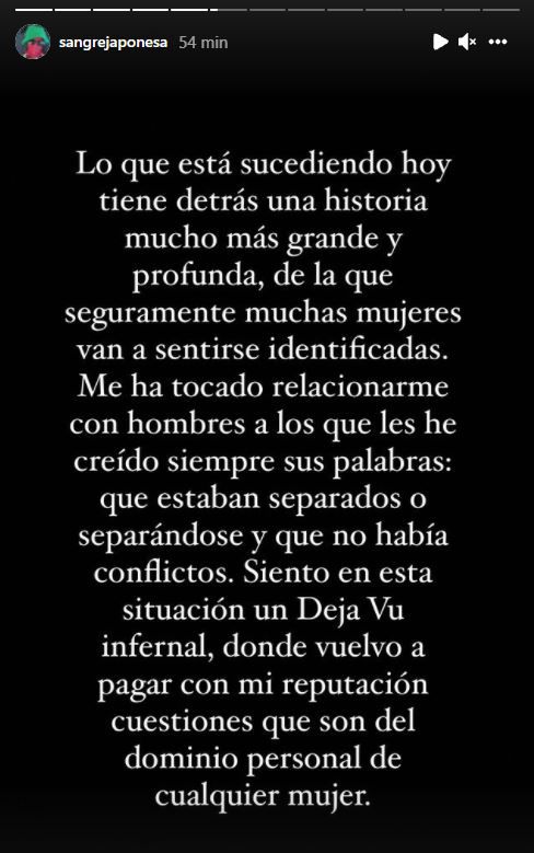 Además, en otra historia, expresa: “Lo que sucedió es una situación que yo no comencé, no alenté y no provoqué. Tener que contar esto también habla de la poca privacidad que tenemos las mujeres. Mientras tanto un montón de calificativos dañinos pidiendo mi cabeza desde hace tiempo, en donde el peso de cómo se me juzga a mí es absolutamente asimétrico. Caso contrario se sabría que yo no fui quien insistió y propició esta situación. Asumo mi inexperiencia, falta de entendimiento sobre mucho que seguramente deba aprender de ahora en más. Pero no voy a hacerme cargo por mí y por todas las mujeres que son usadas y juzgadas siempre, de las actitudes de conquistadores seriales que tienen aprendidas estos varones, y que después bien saben esconder. Como dicen ahora, ser empoderada no tiene que ver con dinero, con ser filosa en redes y menos con insultar con los mismos términos que te juzgaron en el pasado, a otra mujer. Tiene que ver con ser justa a la hora de hablar y sobre todo de romper el silencio”.