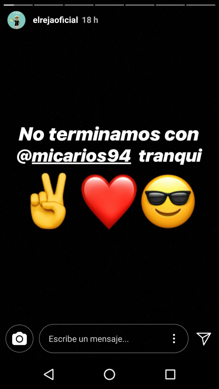 Horas después de haber subido la foto y haber cosechado miles de 'Me Gusta' y comentarios de apoyo, El Reja borró lo foto y subió una storie a su Instagram desmintiendo la ruptura. "No terminamos con Mica Ríos. Tranqui", escribió junto a un emoji de un corazón.