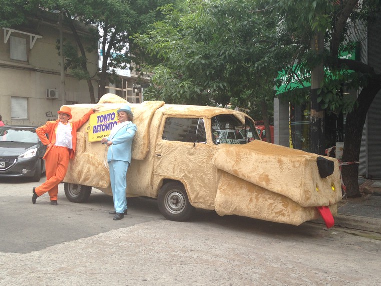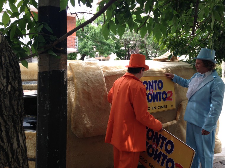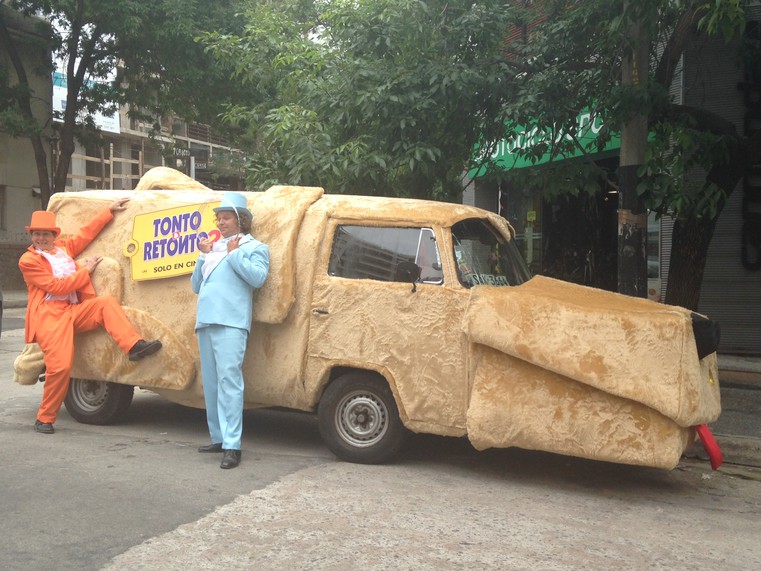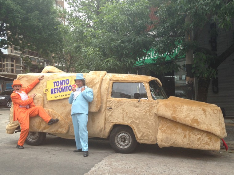Este lunes fue avistado en Montevideo el auto con forma de perro que se hiciera famoso en "Tonto y Retonto", película que finalmente estrenará su esperada secuela.